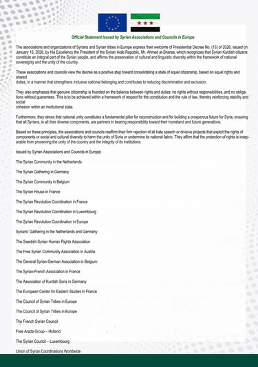 The Syrian Community in the Netherlands reaffirms its ongoing commitment to representing Syria with dignity, responsibility, and integrity. The community respects the laws of the host country and actively contributes to building bridges of communication and cooperation between Syria and European societies, reflecting the shared human, cultural, and historical ties that unite our peoples.
