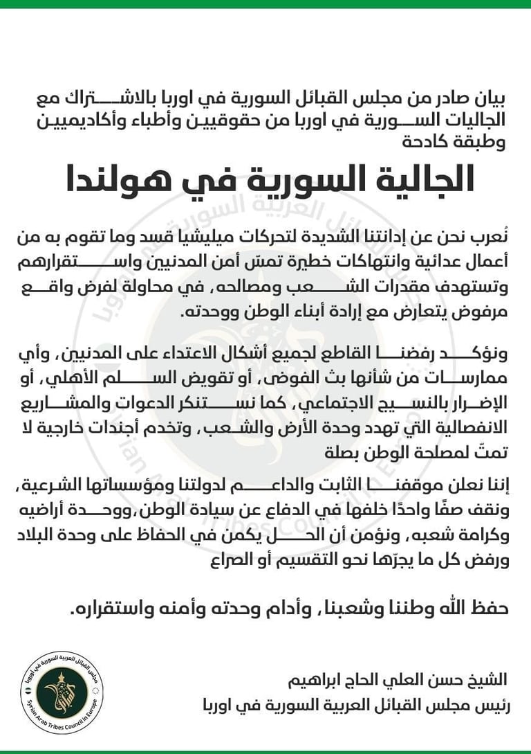 وتجدد الجالية السورية في هولندا موقفها الثابت برفض جميع أشكال العدوان والتدخل الخارجي، وتؤكد وقوفها الكامل إلى جانب الشعب السوري داخل الوطن وخارجه، وتمسكها بوحدة سوريا أرضًا وشعبًا وقيادة، ورفضها تحويل الوطن إلى ساحة لتصفية الحسابات أو فرض الإملاءات.