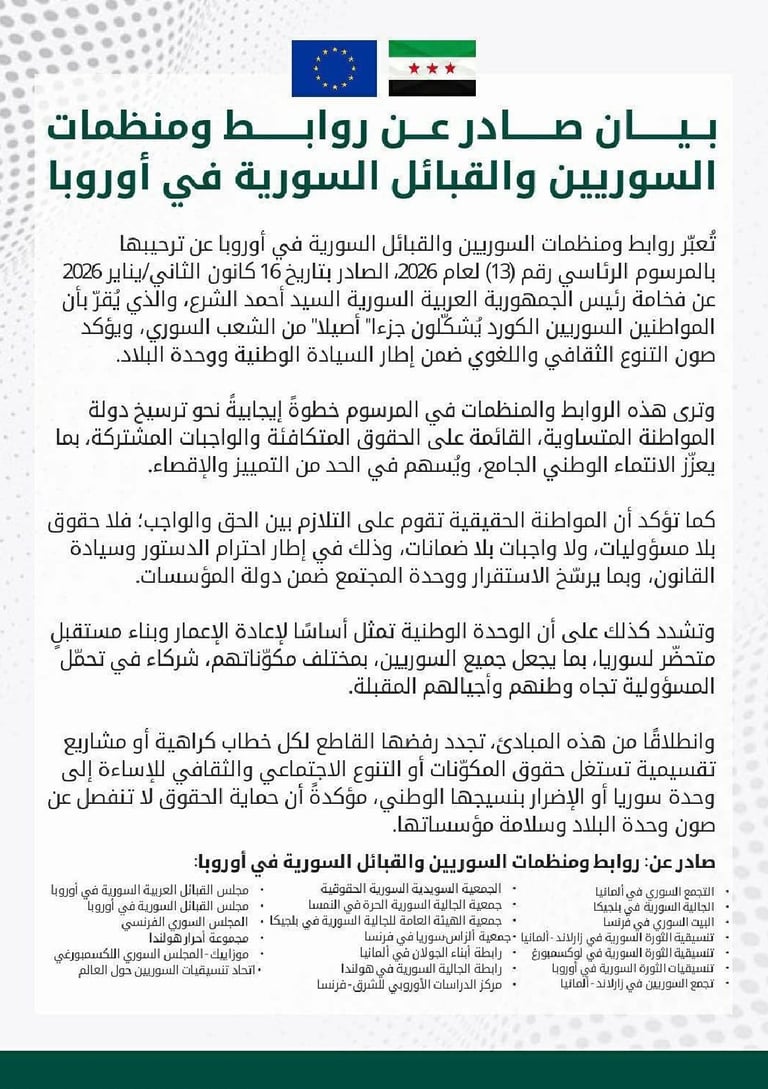 بيان صادر عن مجلس القبائل السورية في اوربا بالاشتراك مع الجاليات السورية في اوربا بما فيها من حقوقيين وأطباء وأكاديميين وطبقة كادحة .