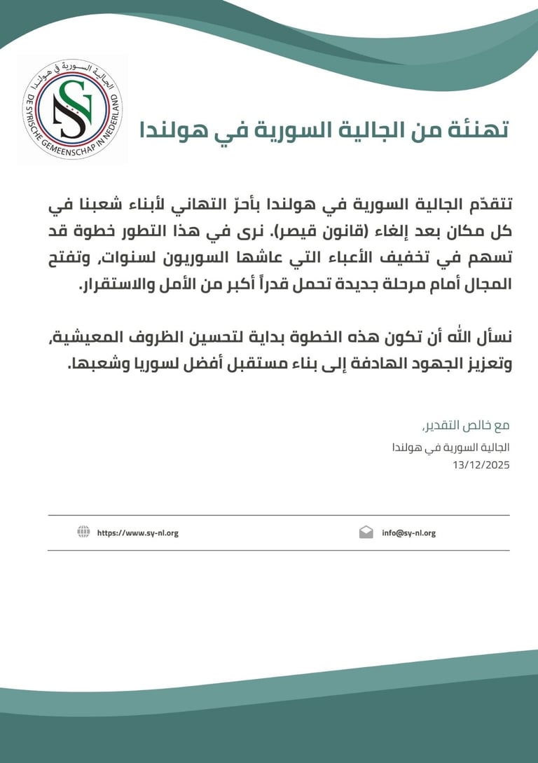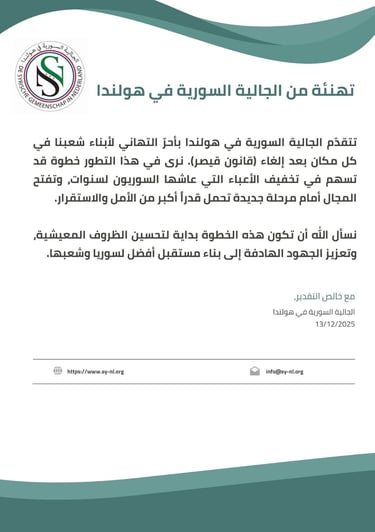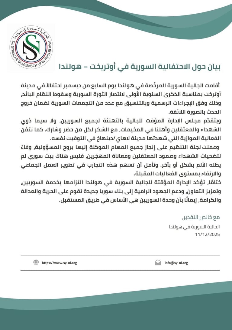 وتجدد الجالية السورية في هولندا موقفها الثابت برفض جميع أشكال العدوان والتدخل الخارجي، وتؤكد وقوفها الكامل إلى جانب الشعب السوري داخل الوطن وخارجه، وتمسكها بوحدة سوريا أرضًا وشعبًا وقيادة، ورفضها تحويل الوطن إلى ساحة لتصفية الحسابات أو فرض الإملاءات.